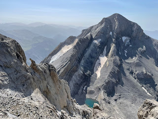 Tenemos el día claro con vistas 360º hasta donde nos alcanza la vista, vamos girando y vemos, Ibón de Marbore , Pineta , a lo lejos Aneto, Añisclo , Ordesa y casi vemos a nuestros compis en el cilindro, todo un espectáculo de relieves y colores.